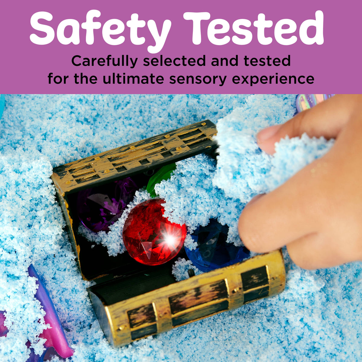 Develop and practice fine-motor movement with super light and fluffy wiggly foam and under-the-sea toys in this Mermaid Sensory Bin. Contents include: wiggly foam, mermaids, treasure chest and gems, seahorse, coral, shovel, shell, and a squeaky octopus! Conveniently packed in a bin with lid for easy storage. Bin measures approximately 14 ½" x 10 ¼" X 4 ¾". Recommended for ages 3+.