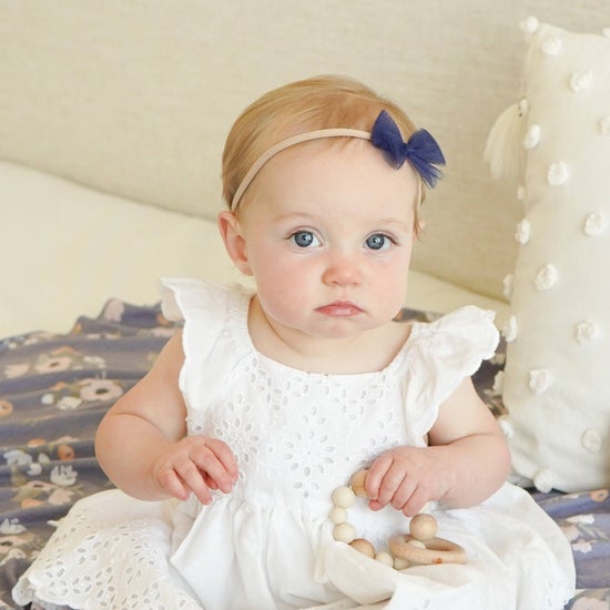 Each bow is hand tied and can either come on a stretchy one-size-fits-all nylon headband OR a non-slip alligator clip. This bow is secured so it won't come undone and won't fray!