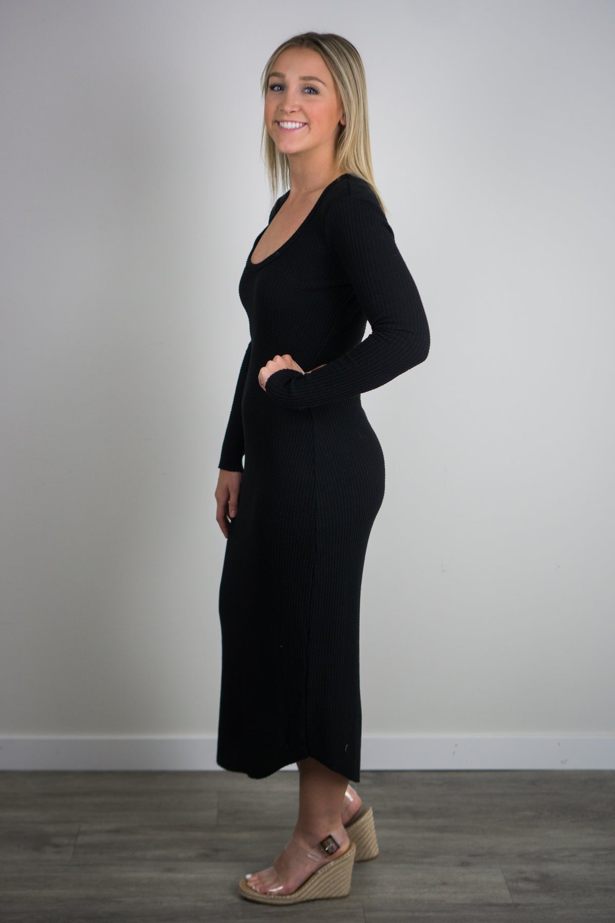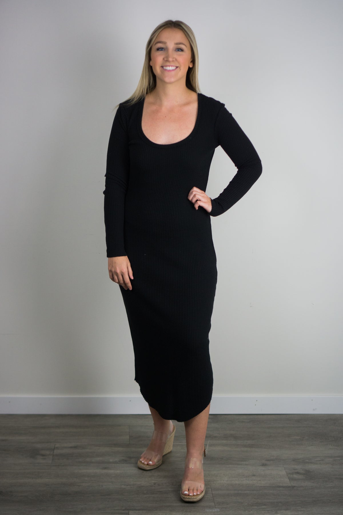 The Zoey Waffle Midi Dress is effortlessly stylish with the added bonus of being extra cozy. Made in our Large Waffle brushed thermal fabric, it’s soft but elevated. The Zoey pairs perfectly with booties. Details include long sleeved, crew neckline, midi length with a shirttail hemline and subtle raw edge detailing.