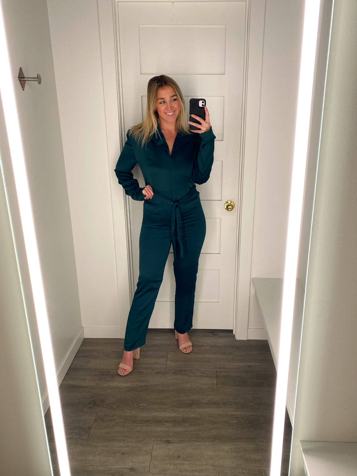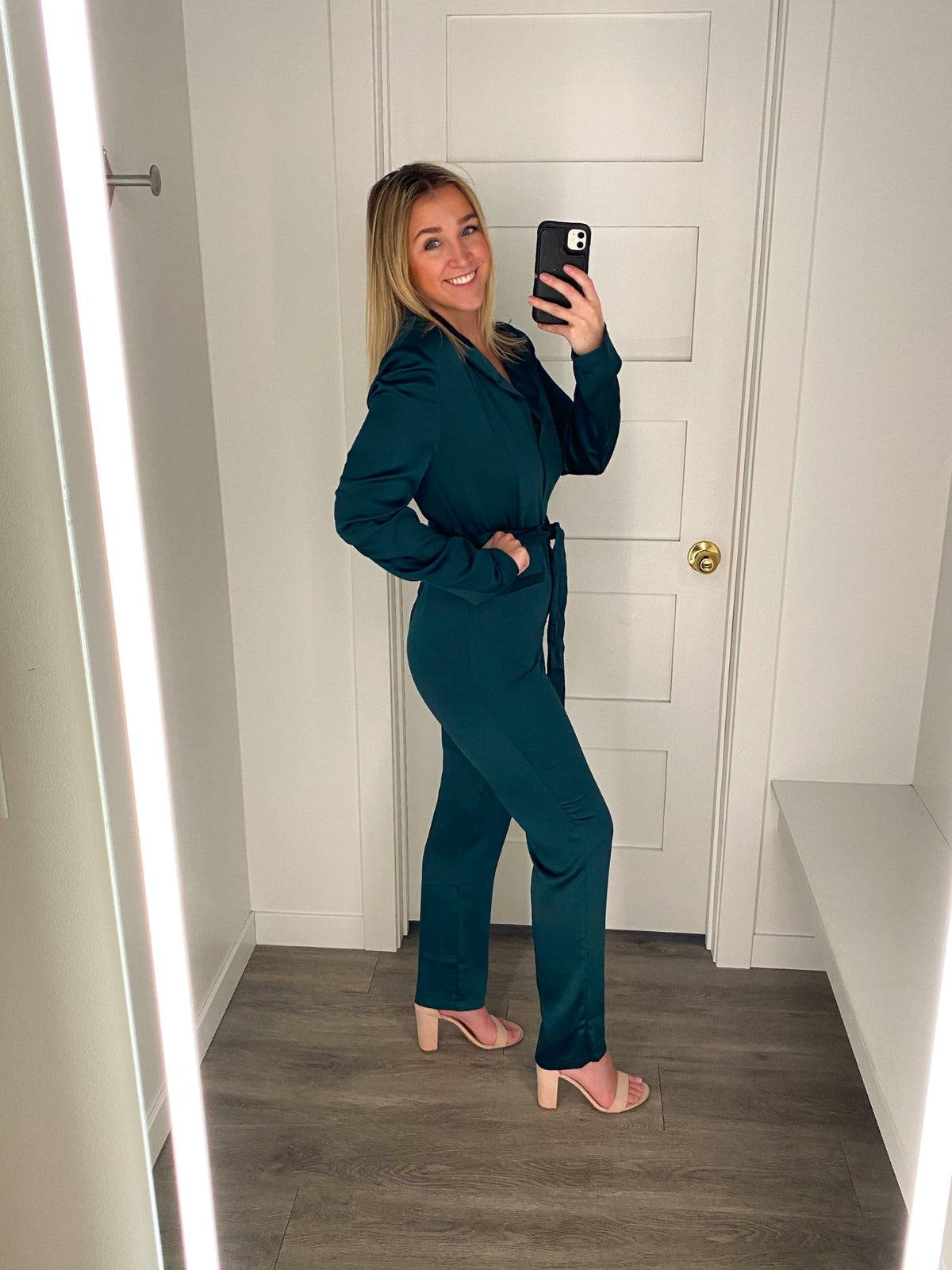 Lustrous satin elevates this polished long-sleeve jumpsuit designed with peaked lapels and a waist-cinching sash.