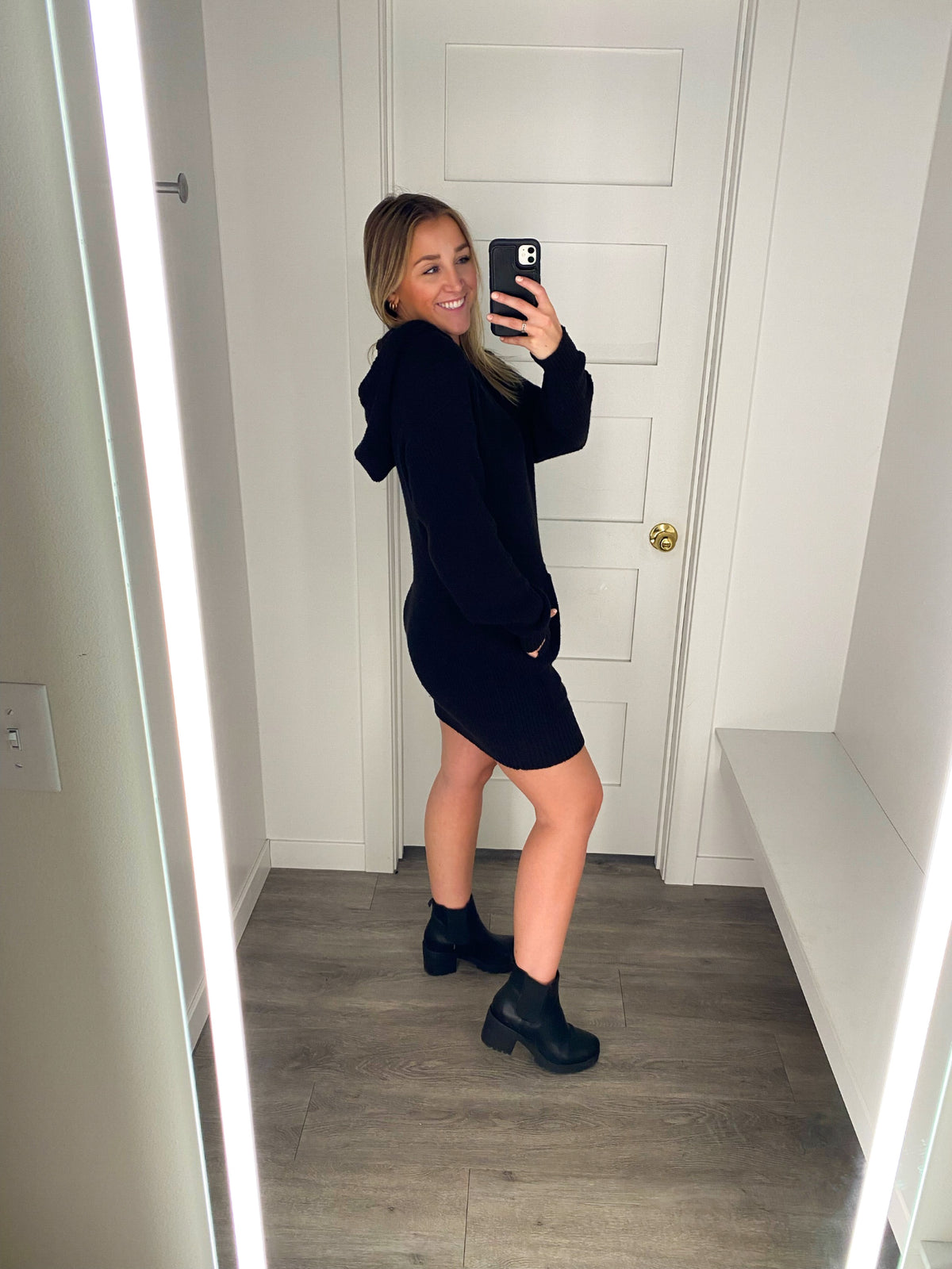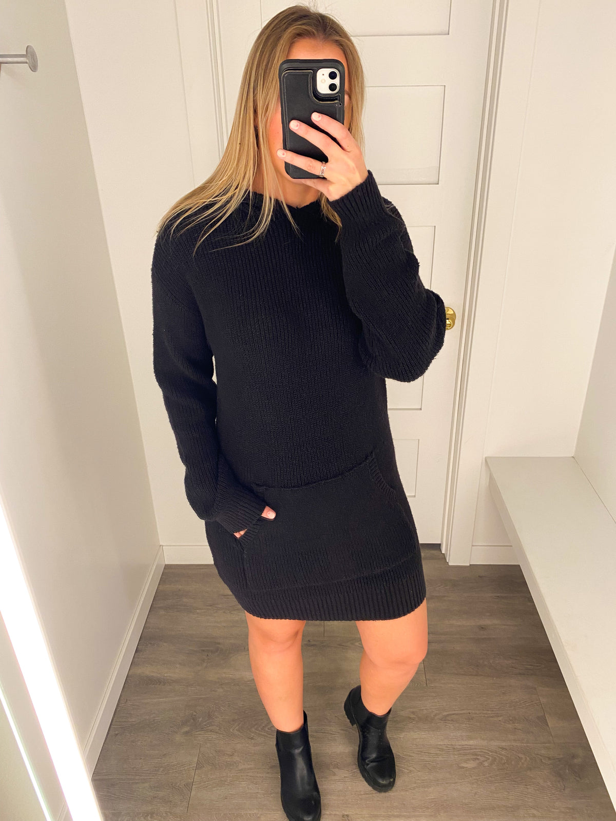 Strike a perfect balance between casual and sophisticated with this hooded sweater-dress complete with a kangaroo pocket.