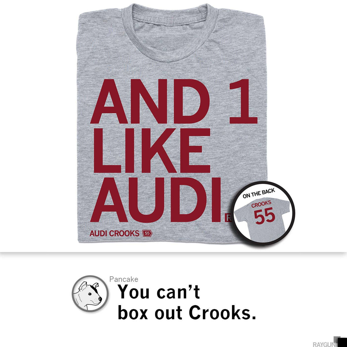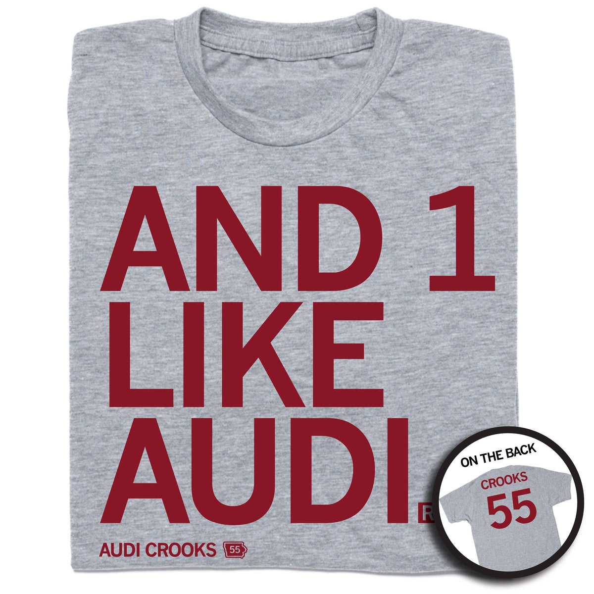 And 1 like Audi. Approved by Audi Crooks. A Portion of All Raygun Sales Raise Money For Organizations That We Support. Cardinal Red Screen Print on a Heather Grey T-shirt (65% Polyester / 35% Combed Ringspun Cotton). Cut sewn sweatshop free. Designed and Printed by Union Labor at Raygun.