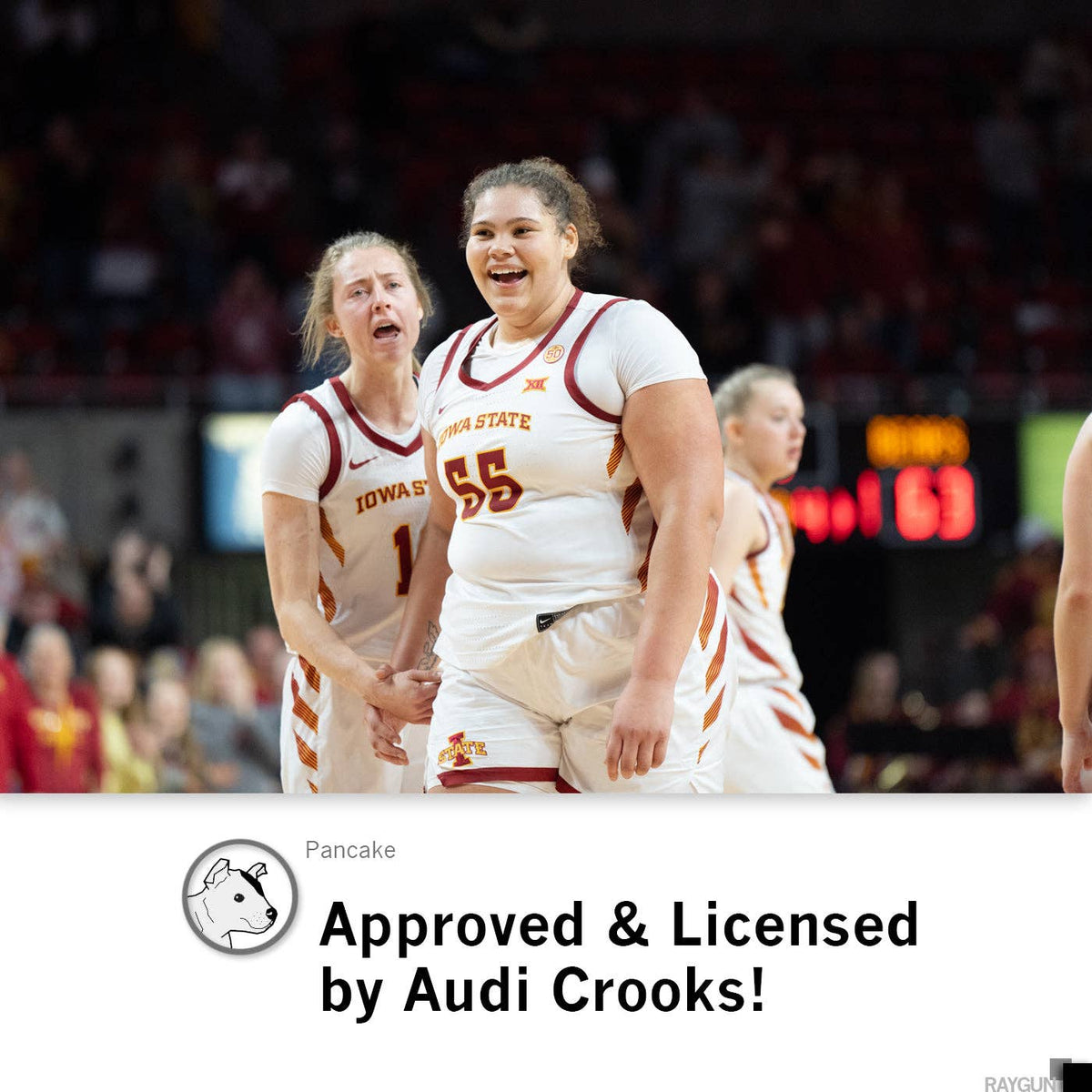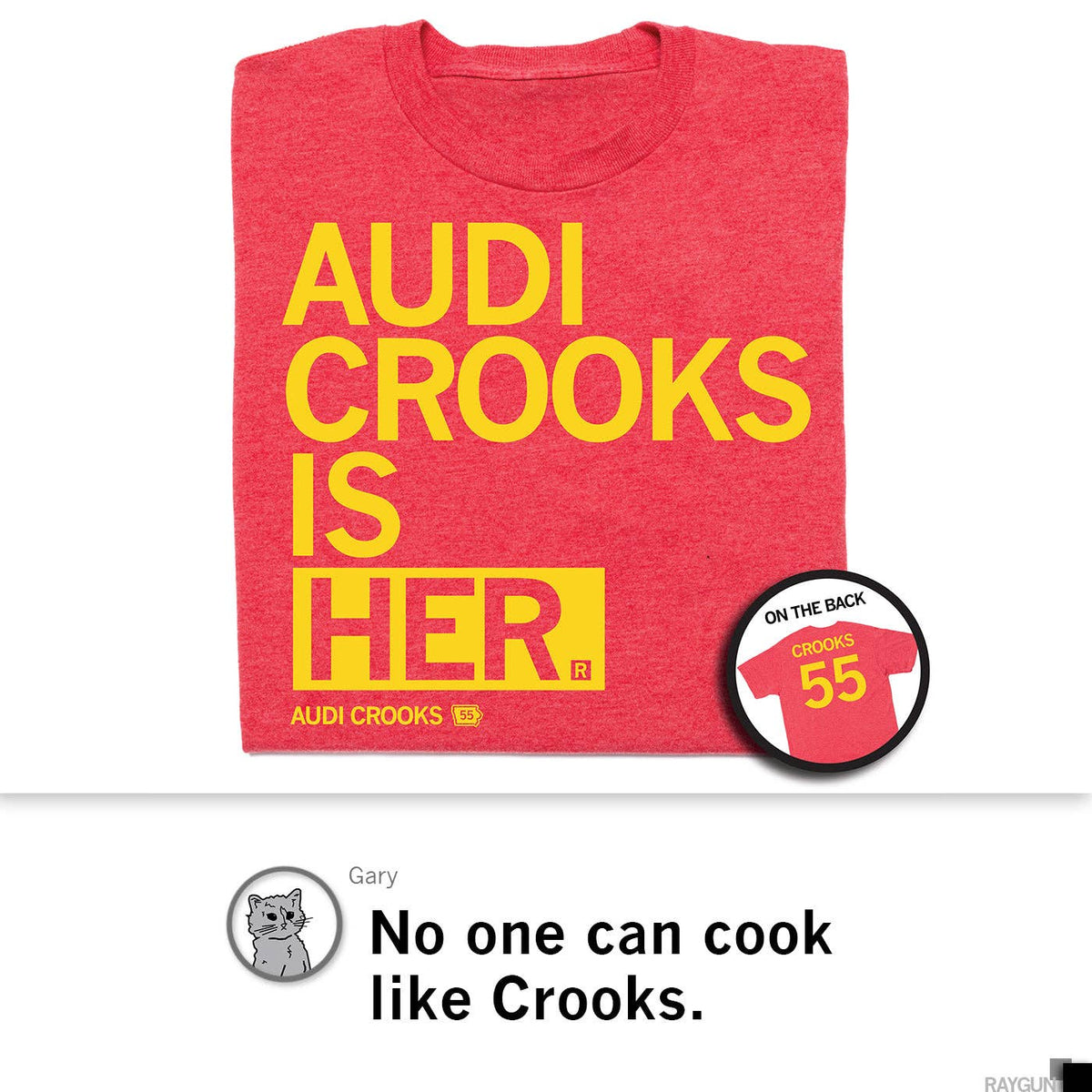 Audi Crooks Is Her. Approved by Audi Crooks. A Portion of All Raygun Sales Raise Money For Organizations That We Support. Gold Screen Print on a Heather Red T-shirt on Front and Back (50% Combed Ringspun Cotton / 50% Polyester). Cut and sewn sweatshop free. Designed and printed by Union Labor at Raygun.