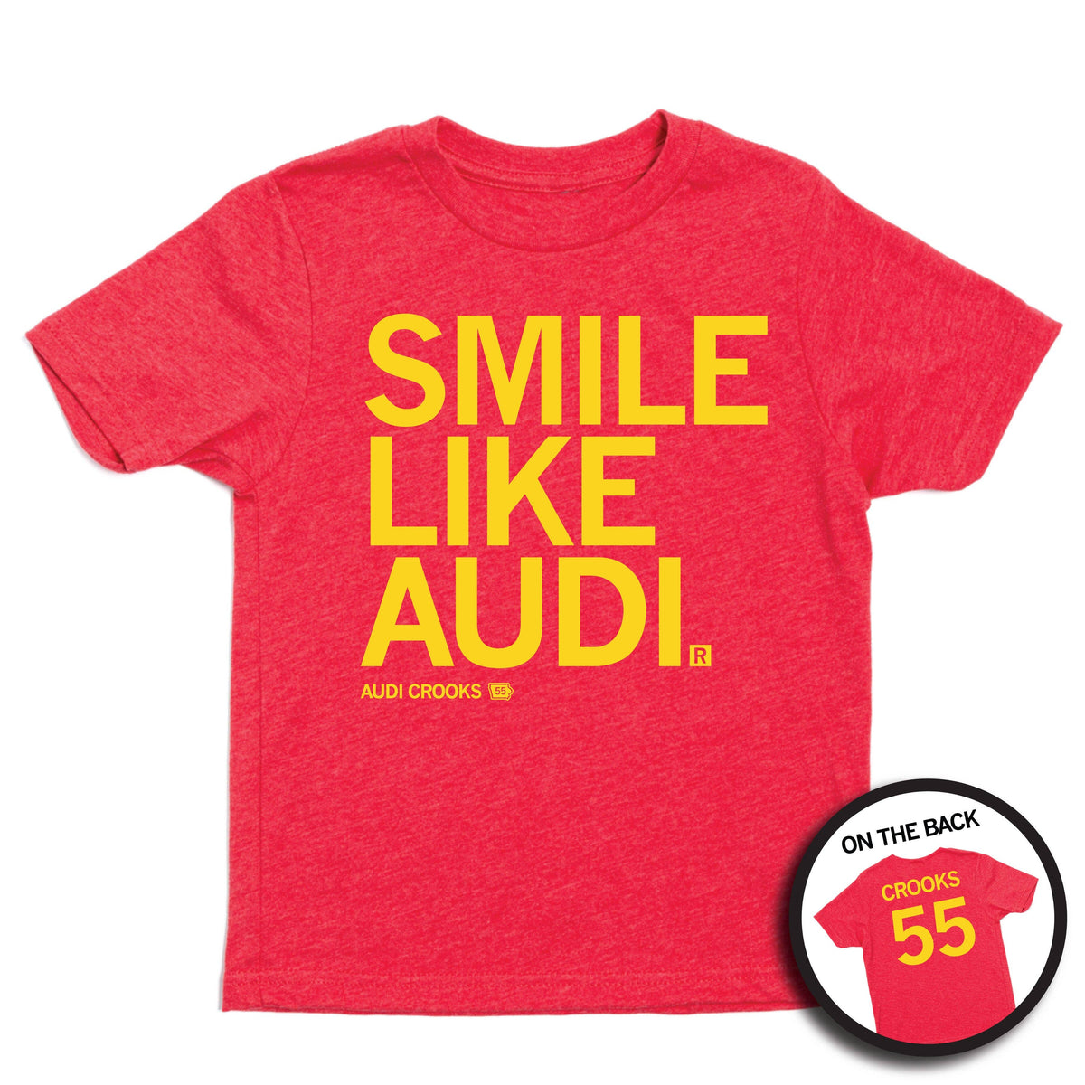 Smile like Audi. Approved by Audi Crooks. A Portion of All Raygun Sales Raise Money For Organizations That We Support. Gold Screen Print on a Heather Red T-shirt (60% Combed Ringspun Cotton / 40% Polyester ). Cut and sewn sweatshop free. Designed printed by Union Labor at Raygun.