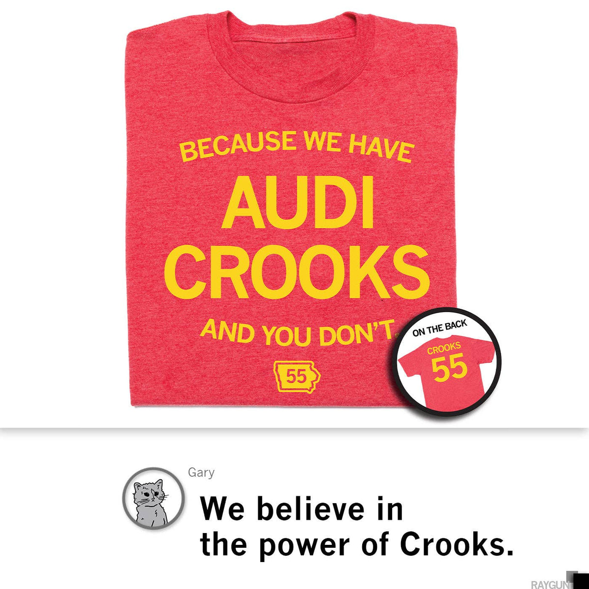 Because we have Audi Crooks and you don't. Approved by Audi Crooks. A Portion of All Raygun Sales Raise Money For Organizations That We Support. Gold Screen Print on a Heather Red T-shirt on Front and Back (50% Combed Ringspun Cotton / 50% Polyester). Cut and sewn sweatshop free. Designed and printed by Union Labor at Raygun.