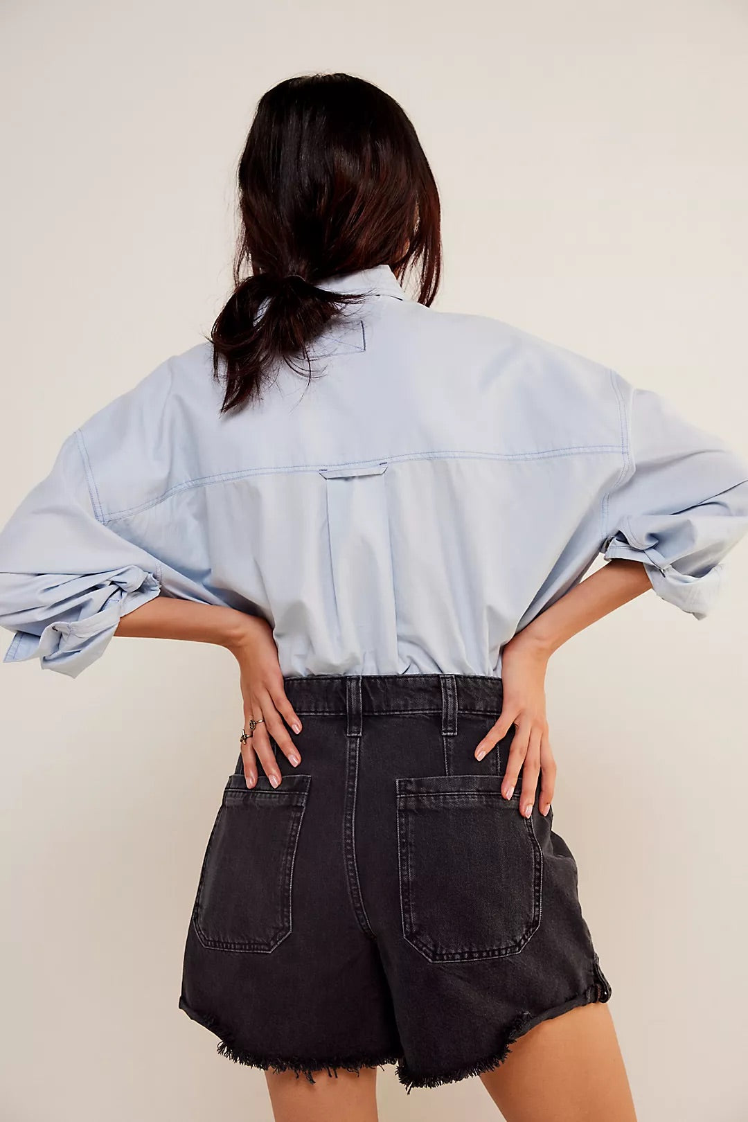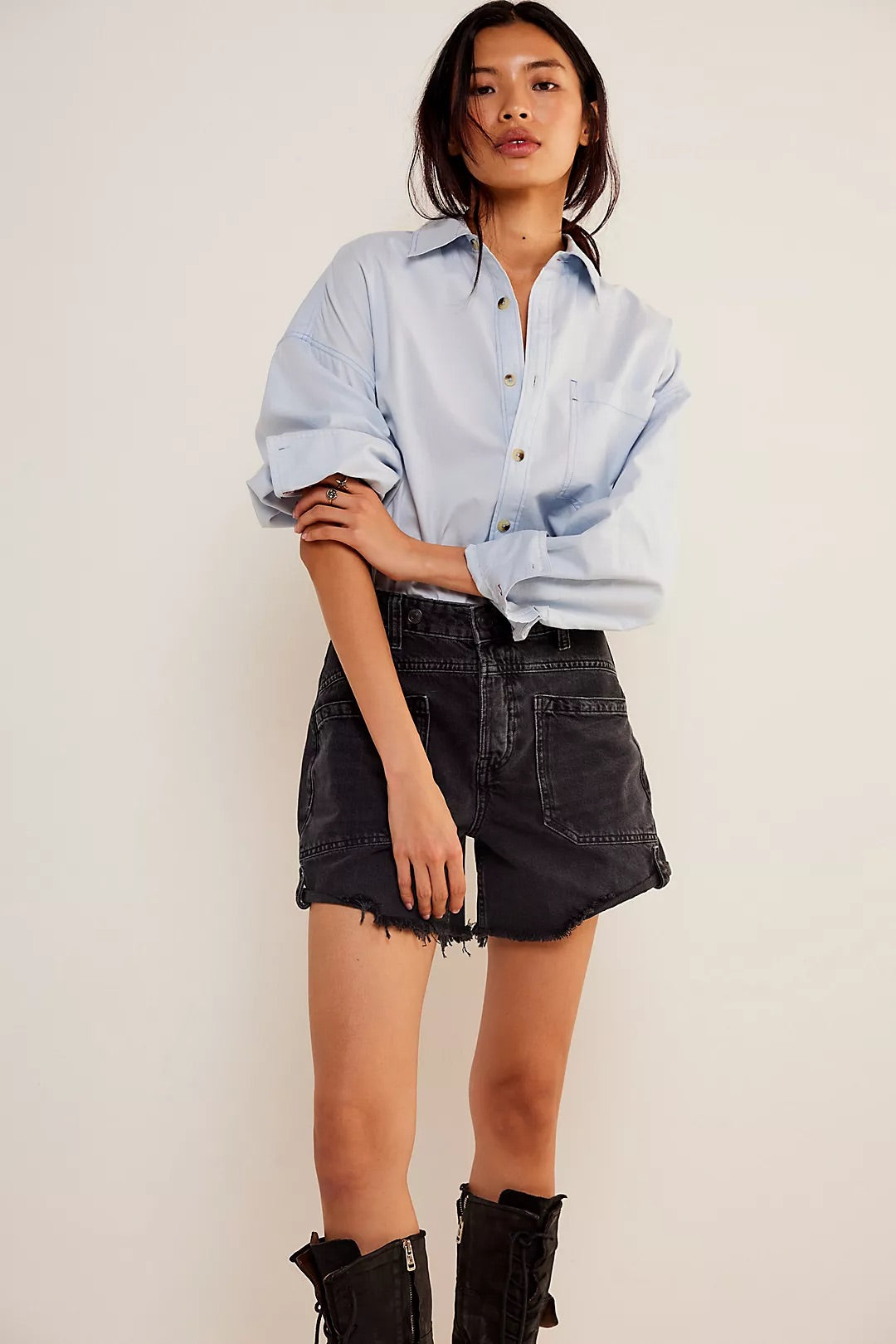 Features: Zip fly and button closure, button detailing at the waistband, raw-edge curved hem, patch pockets