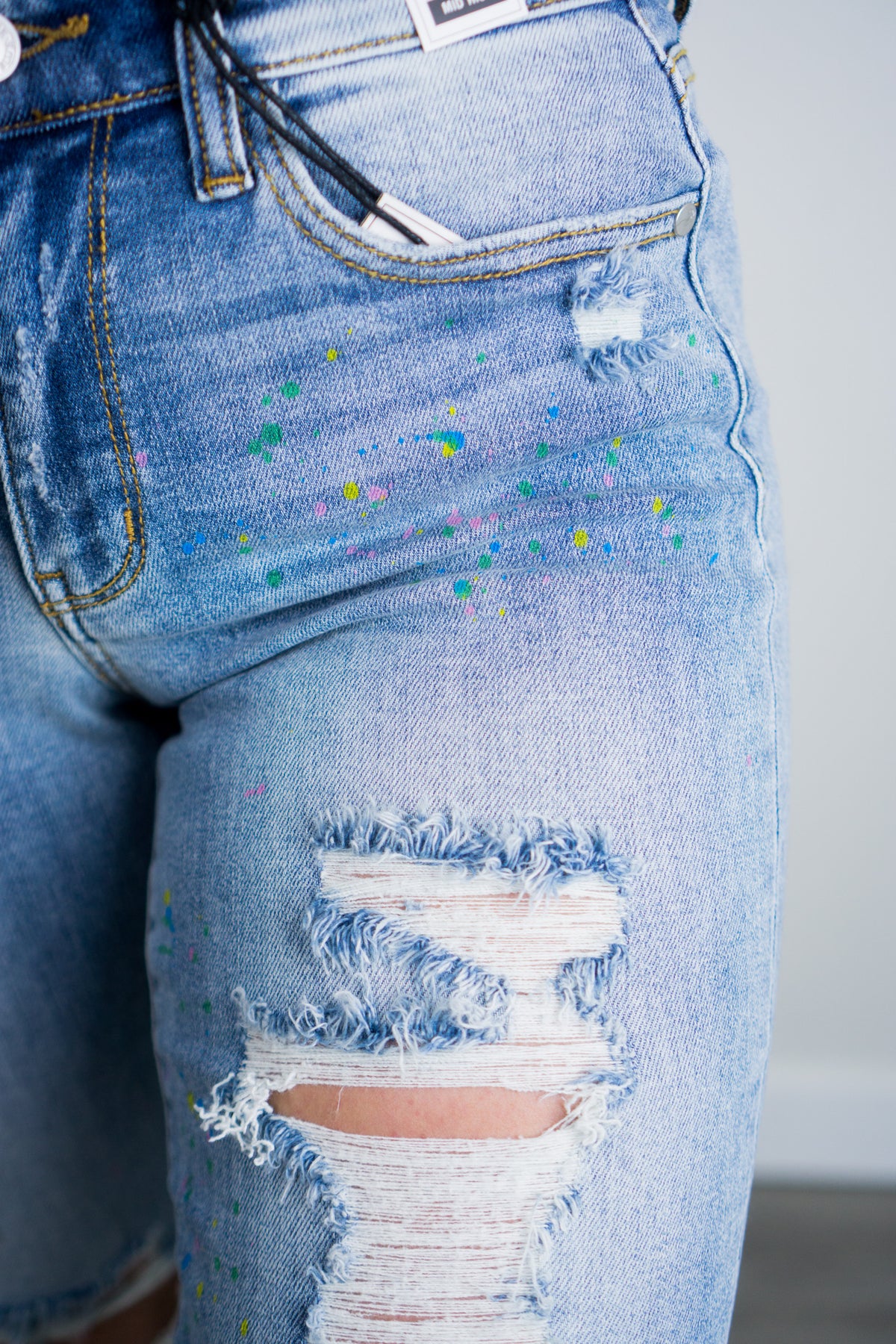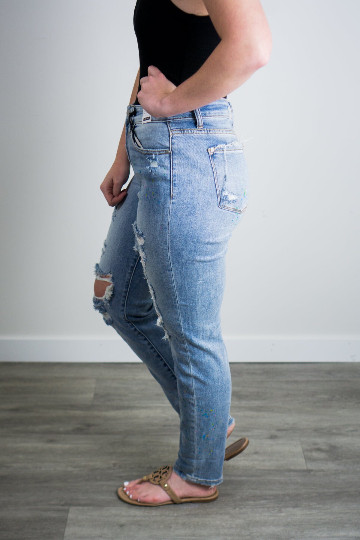 Judy Blue Mid-Rise Boyfriend Multi Color Paint Splash Destroyed