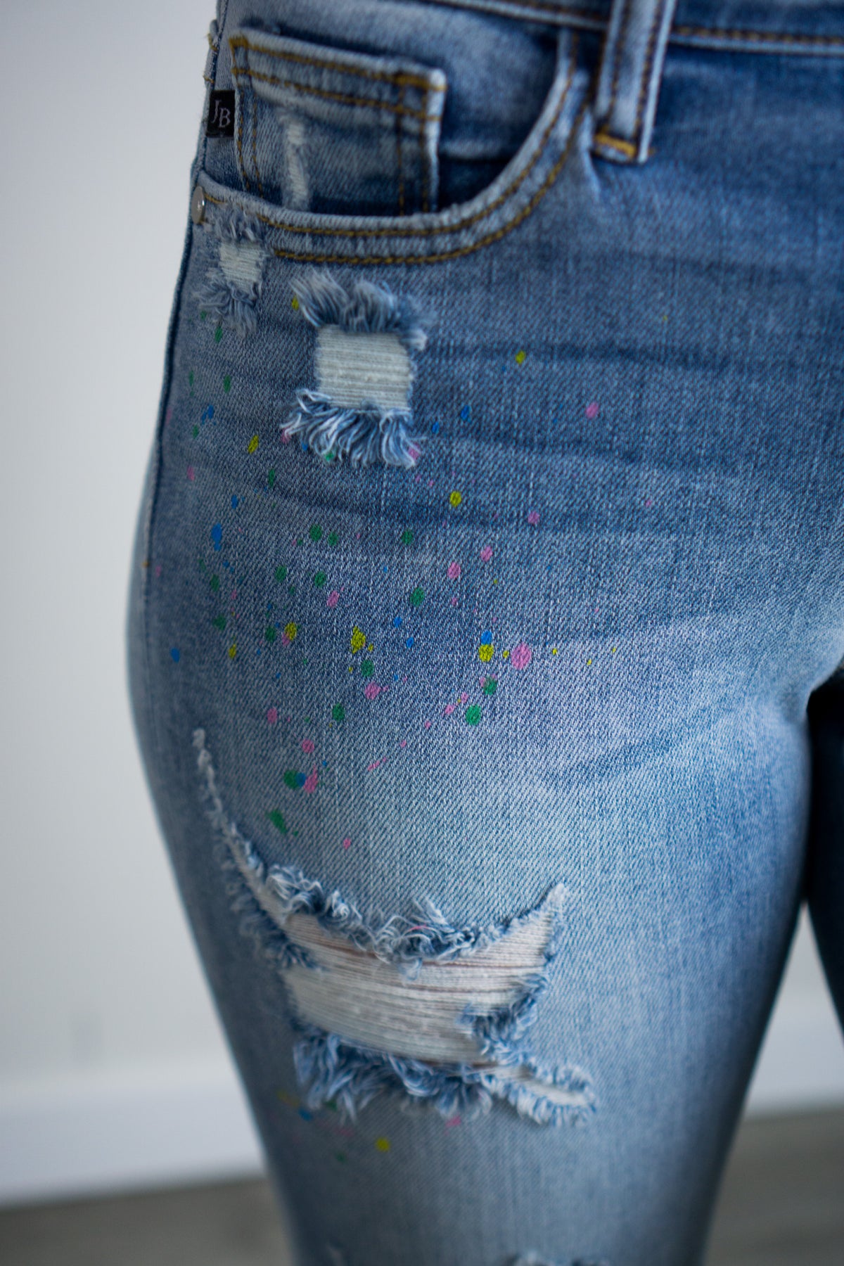 Judy Blue Rainbow Paint Splash Destroyed Boyfriend, Mid-Rise Light Wash Jeans (Style: 82245). Remember that boyfriend fit are meant to be more loose fitting. If you wish to have them more fitted, size down one.