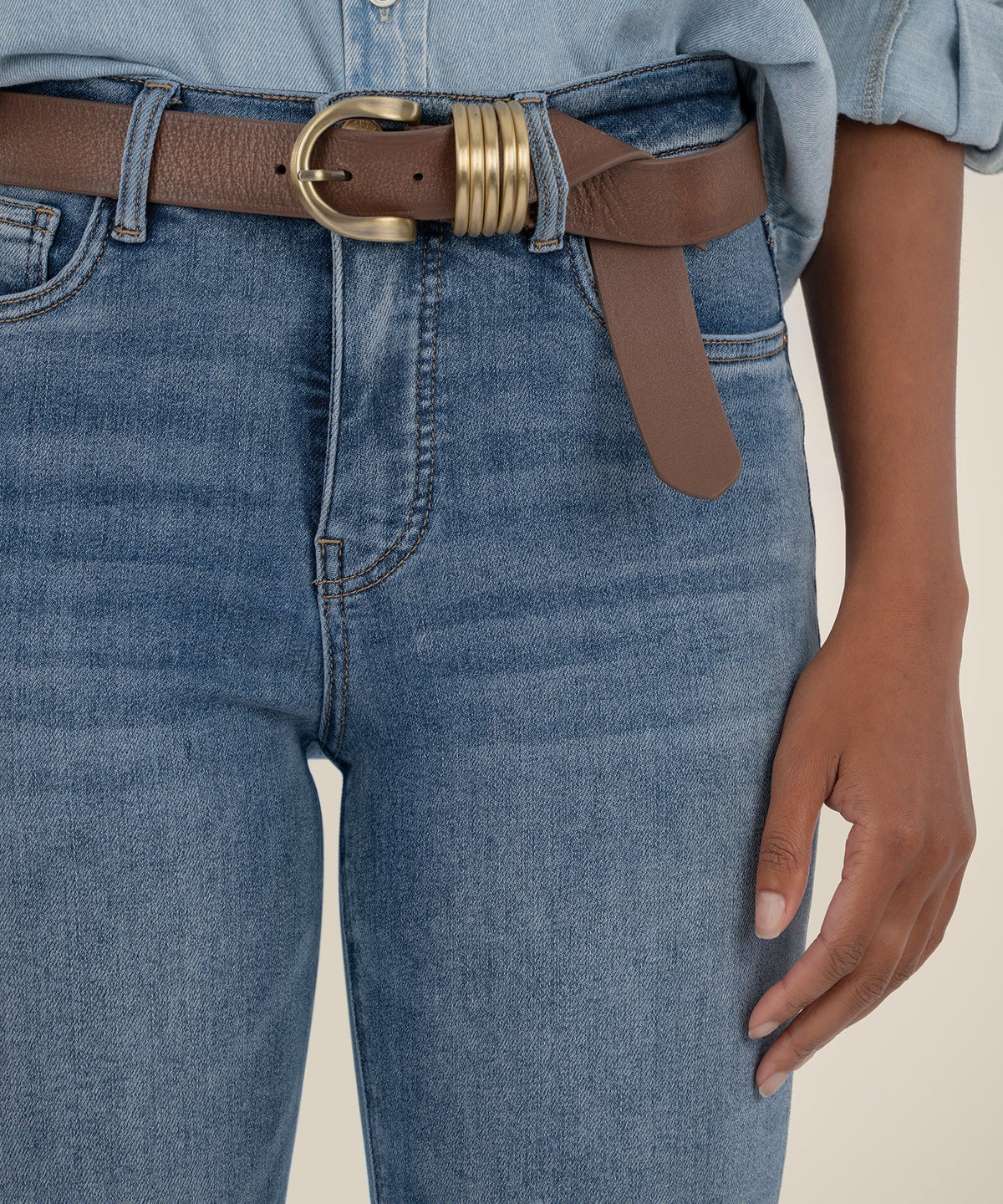 • Refresh your wardrobe with jeans flaunting a high waist with Fab Ab, raw hems and tapered legs for a retro-inspired silhouette.