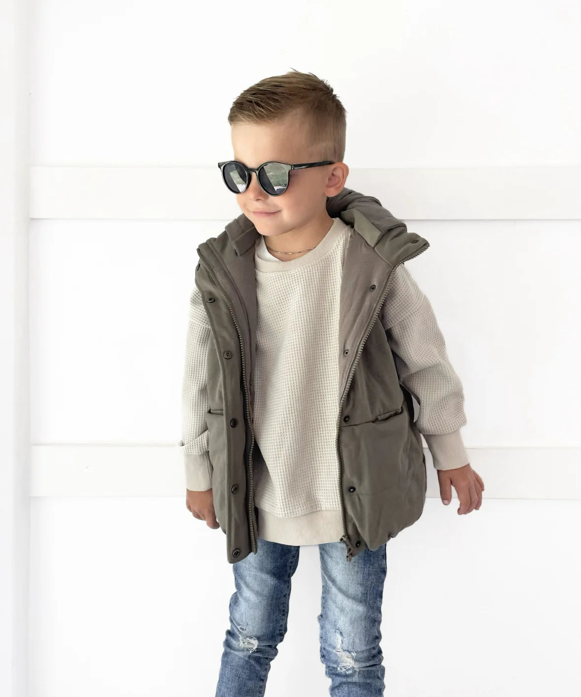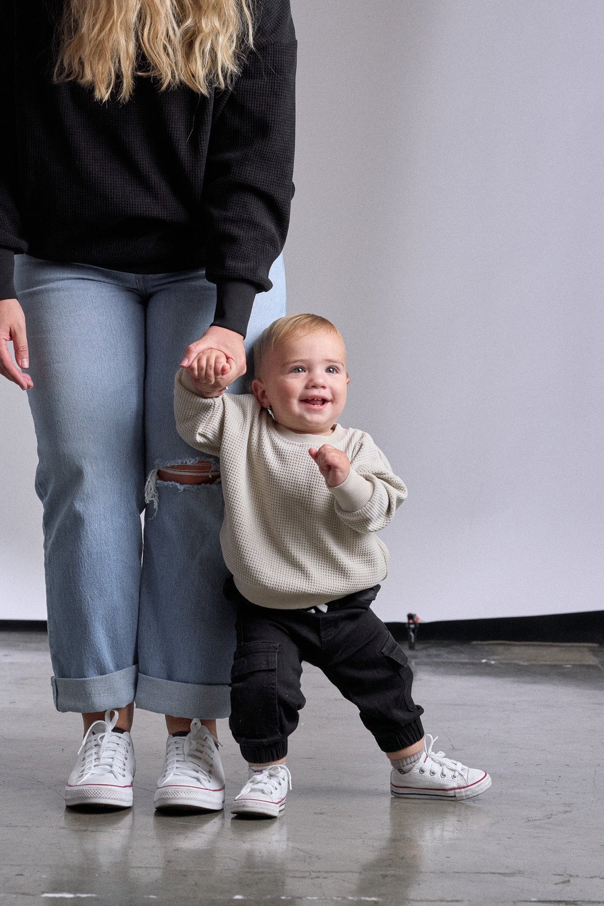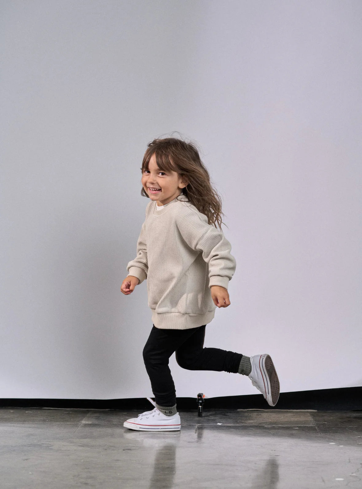 Introducing the Elevated Waffle Crewneck—a perfect fusion of cozy comfort and elevated style. Drawing inspiration from our beloved waffle collection and signature elevated sets, this crewneck is made from a soft waffle-knit fabric that's both lightweight and warm, making it ideal for layering through fall and winter. Available in versatile shades—Black, Greige, and Army Green—this wardrobe essential will keep your little one looking stylish and feeling comfortable, whether they're out exploring or relaxing at home.