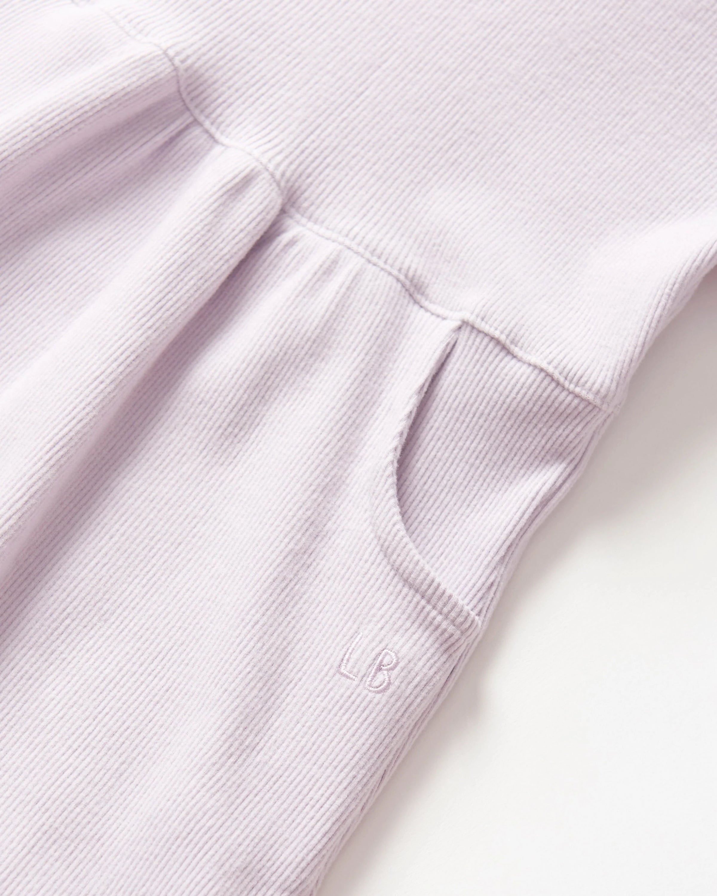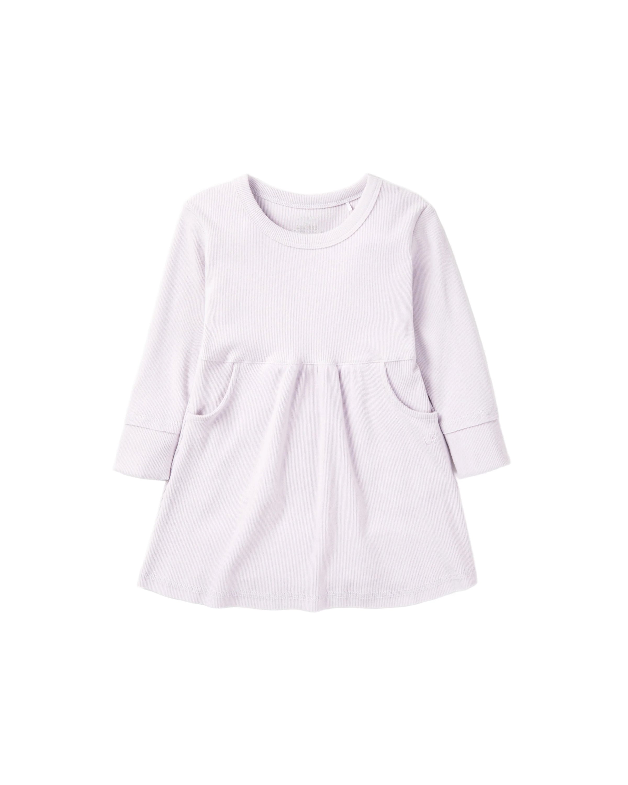 Soft, simple, and made for movement. The brushed ribbed fabric and ribbed trim details give this dress a cozy, elevated feel. Finished with functional front pockets and a soft Lilac hue that adds the perfect pop of color for everyday wear.