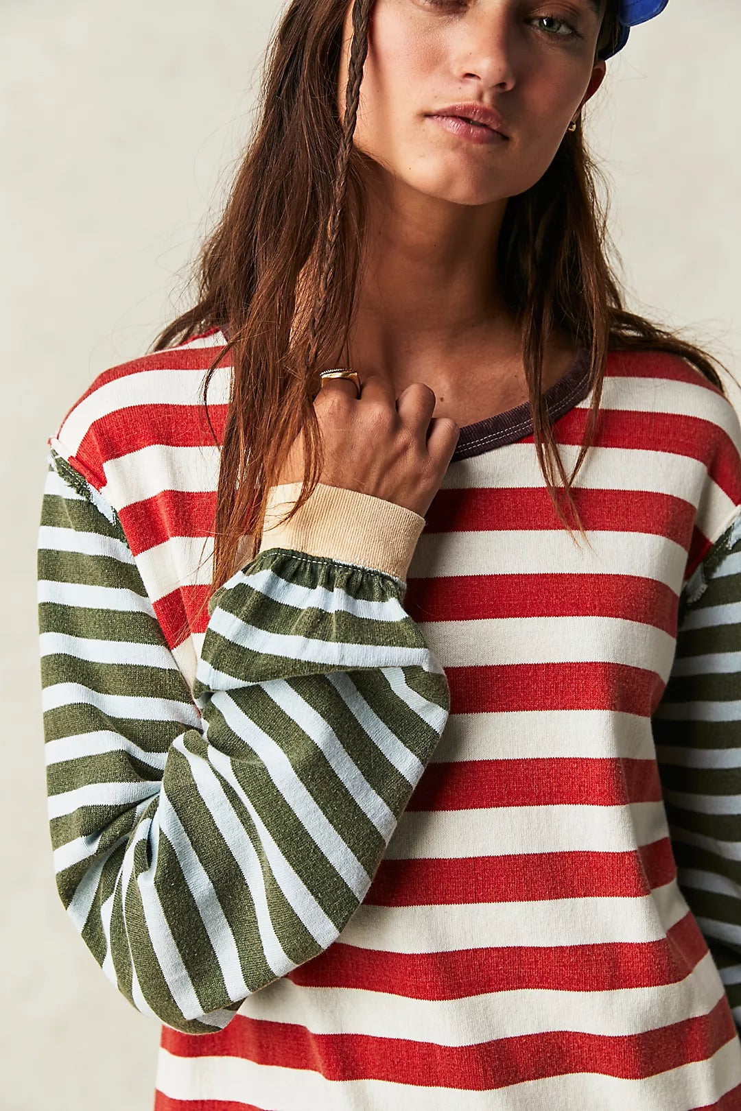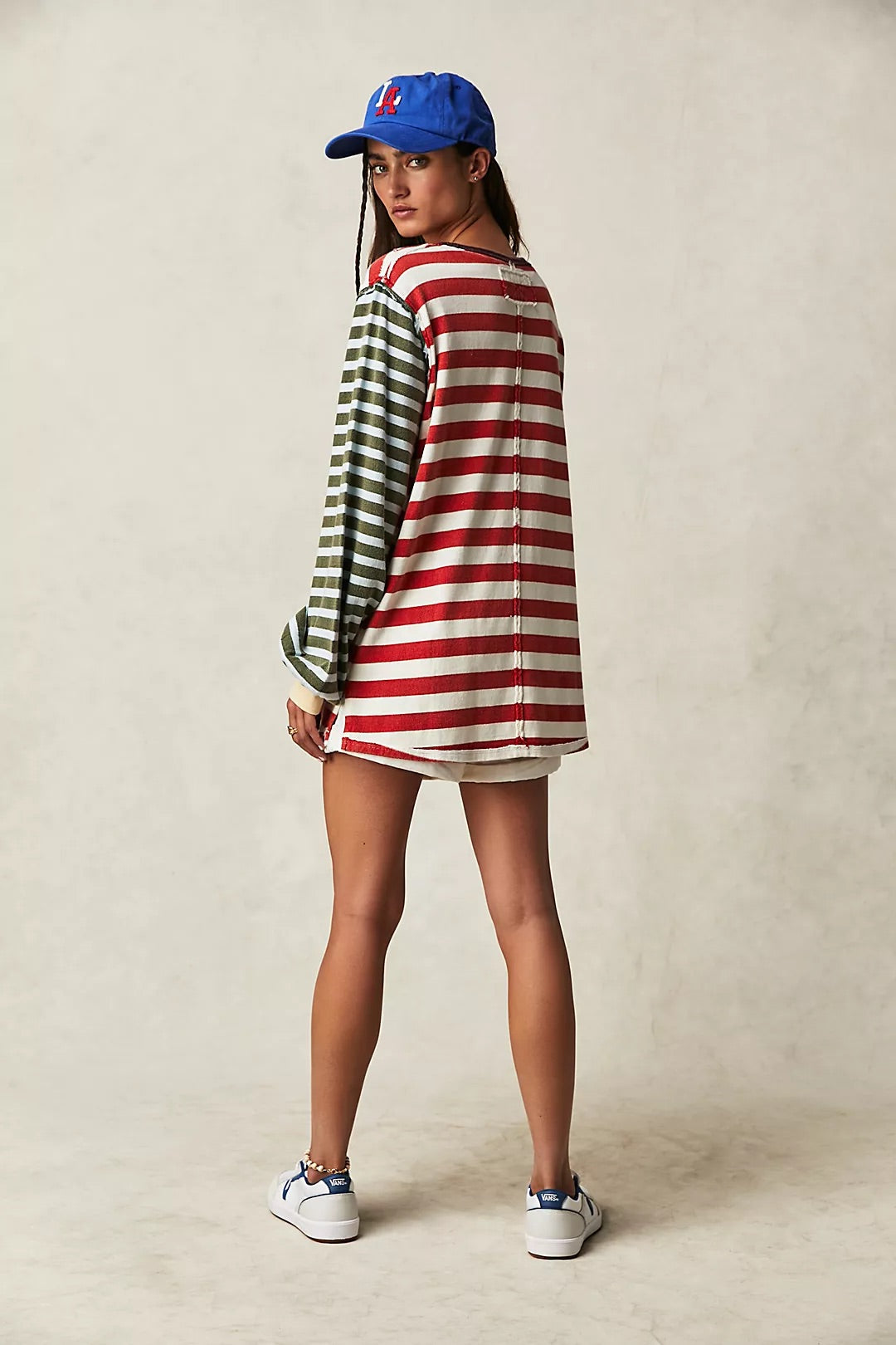 So cool and classic in a slouchy, relaxed silhouette, this goes-with-anything tee is featured in a pieced stripe design with exposed seaming for a true lived-in look.