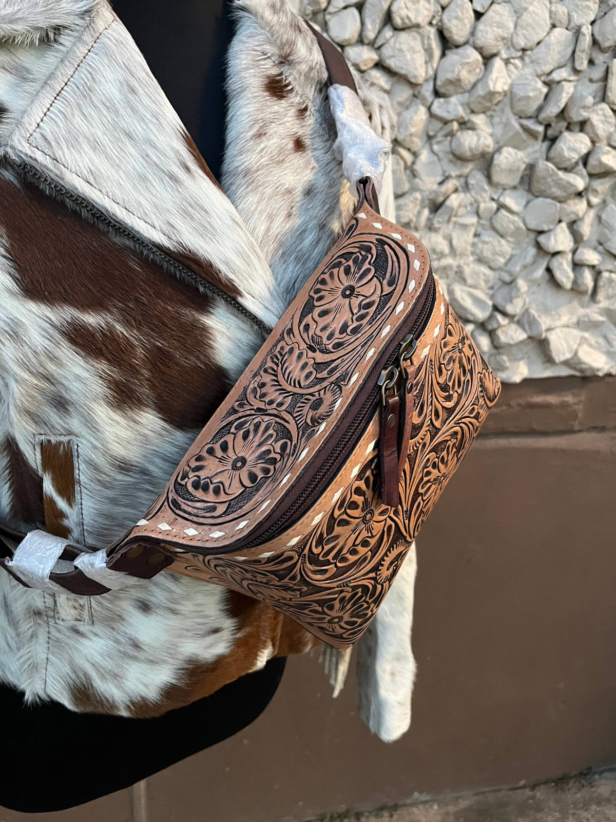 This Cowhide & Tooled Sling Bag is a stylish addition to any outfit, perfect for those who prefer hands-free convenience. Crafted from high-quality materials, this fanny pack is both durable and fashionable.