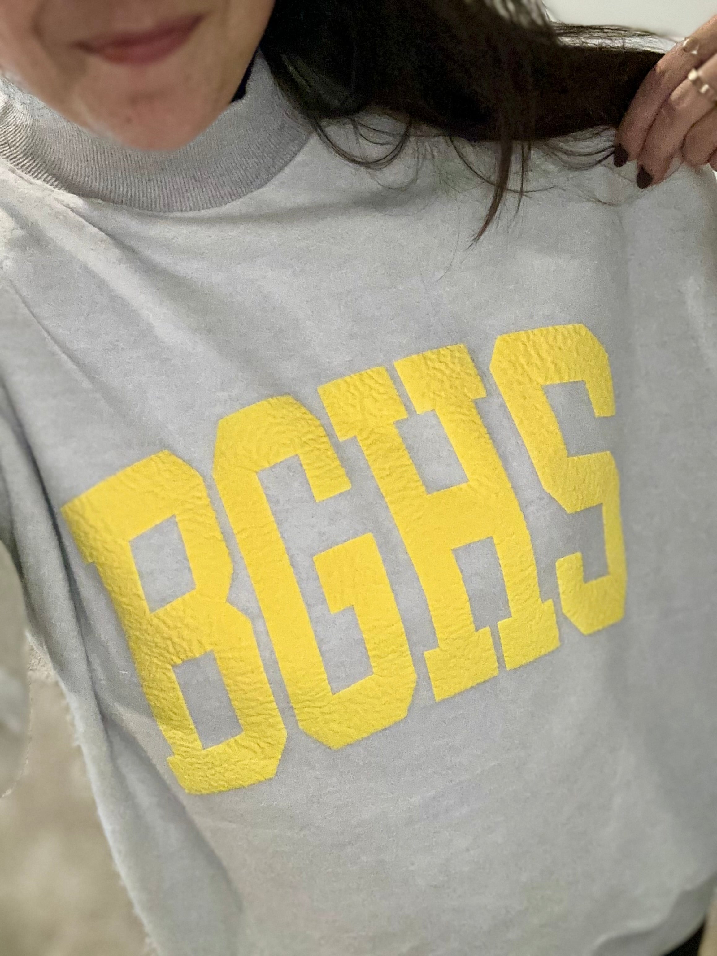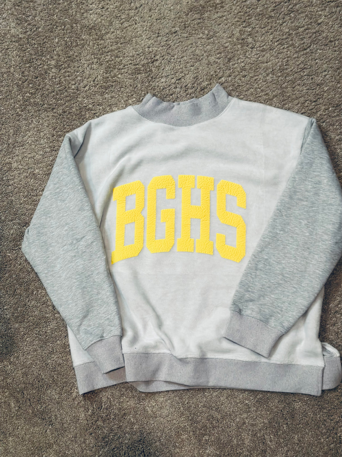 Yellow BGHS logo done by Create Studios on a soft 50/50 poly cotton blend reversible Heather grey mockneck sweatshirt.