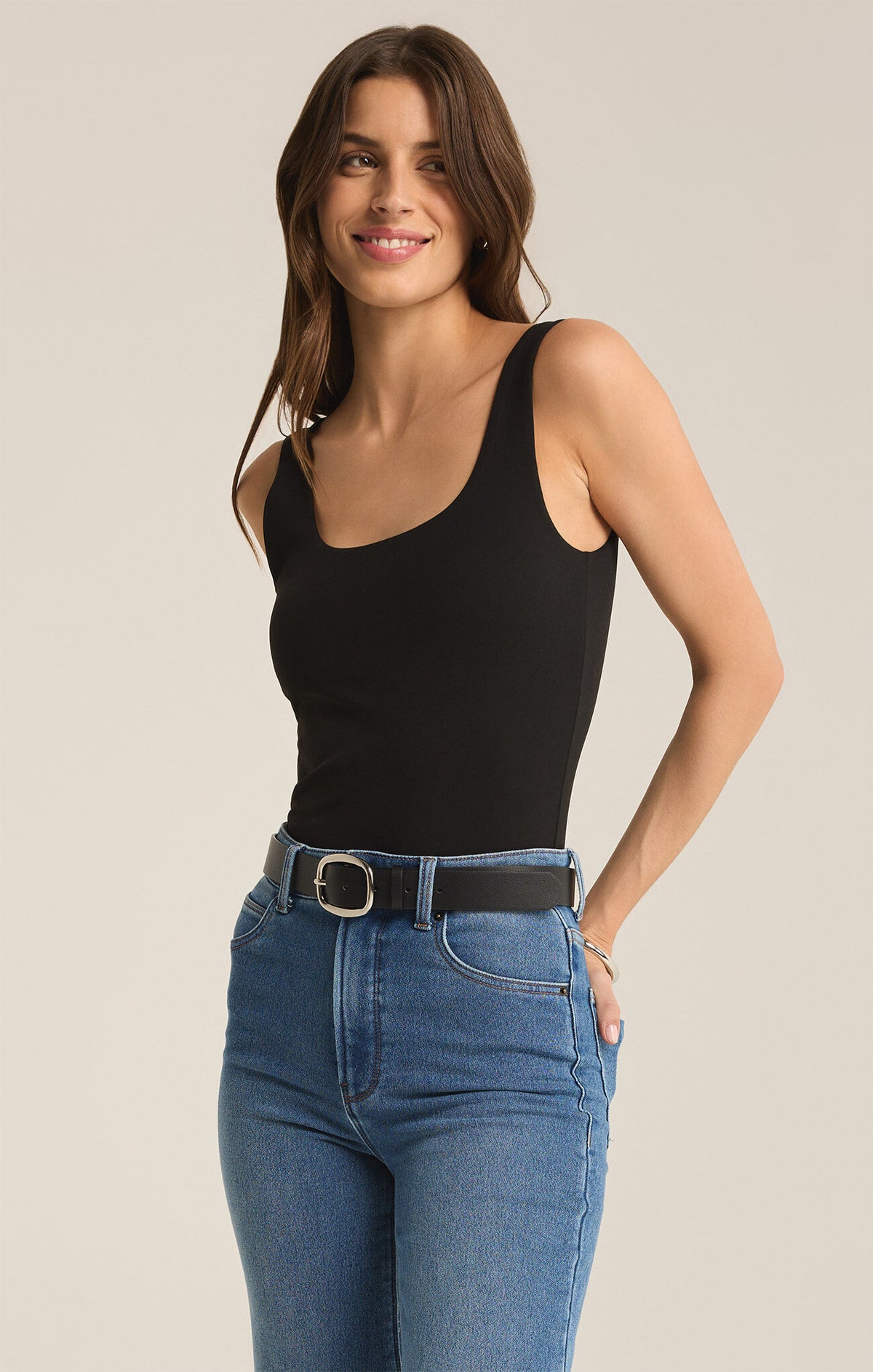 Embrace effortless style with our fitted, scoop neck bodysuit, featuring wide straps and a sleeveless design. Made from a midweight, soft jersey knit and fully lined for comfort, this versatile piece includes a snap button closure for easy wear.