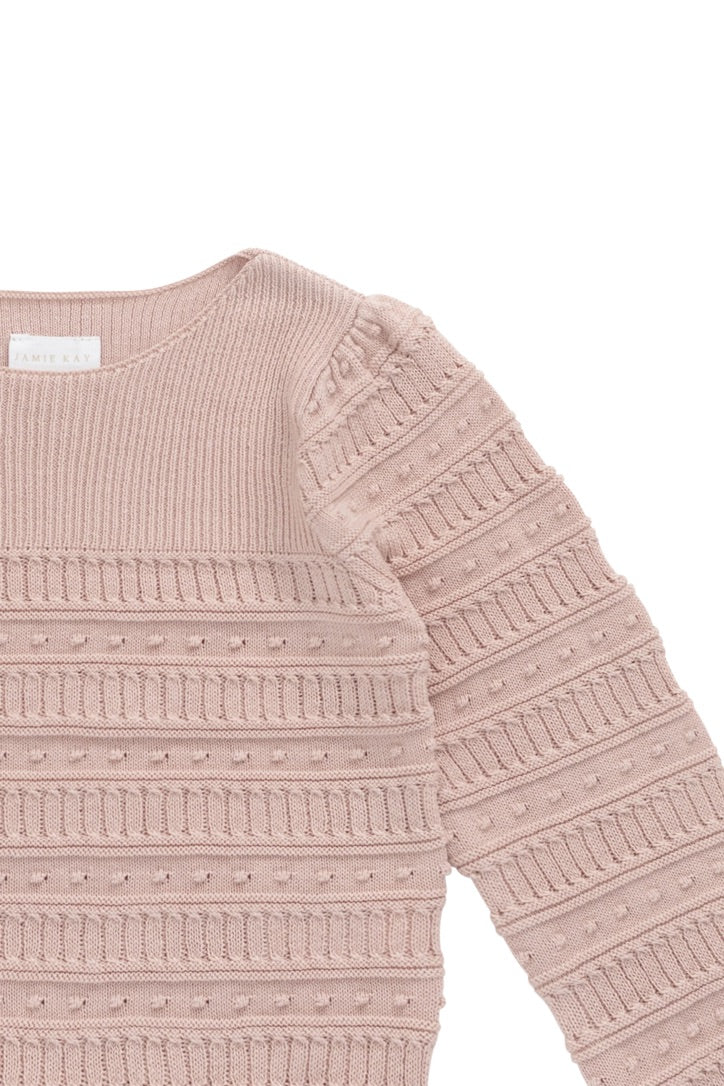 The Myla Top – Shell Pink is a beautifully knitted piece designed to keep your little one warm and stylish. Crafted from 100% cotton, this long-sleeve top features a delicate shell pink hue and a textured knit pattern with horizontal stripe detailing. Ribbed cuffs, neckline, and hem add a snug and comfortable finish, making it perfect for layering in cooler seasons.