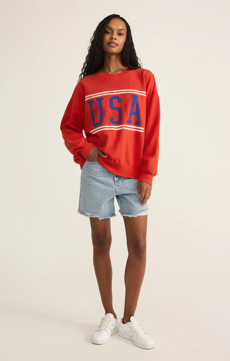 Stay cozy and classic in this oversized sweatshirt with a bold "USA" collegiate graphic. Made from soft 100% cotton brushed fleece, it’s the perfect everyday layer.