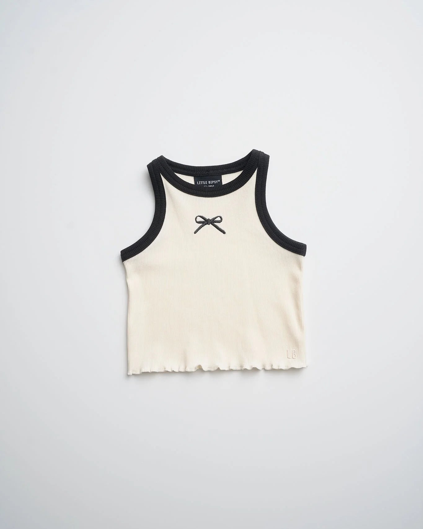 The Bow Ribbed Tank in Vanilla adds a sweet touch to an everyday staple. Designed with a soft ribbed feel, it features an embroidered bow detail and a lettuce trim bottom hem for a playful finish. Complete with our signature embroidered “LB” logo.